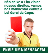 A Fifa está usando a sua autoridade para pressionar o governo brasileiro a aceitar as suas exigências. Os absurdos demandados vão desde a possível suspensão da meia entrada até a demarcação de áreas comerciais exclusivas, prejudicando pequenos comerciantes e economias locais. A agilidade nas negociações mostra que o governo quer aprovar rapidamente a Lei Geral da Copa, antes que haja uma revolta geral contra os abusos. Não vamos ficar quietos! Envie uma mensagem agora para a Fifa e para o governo brasileiro: