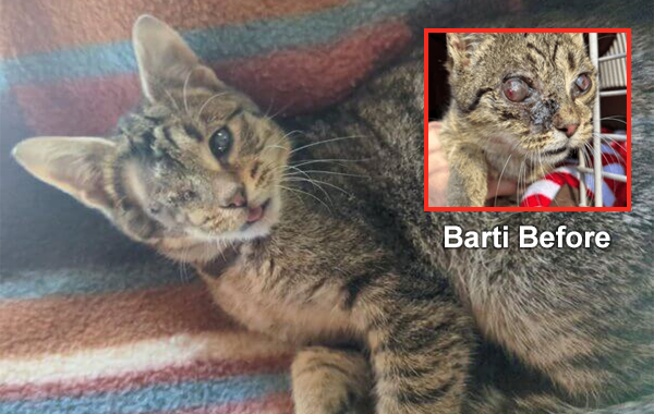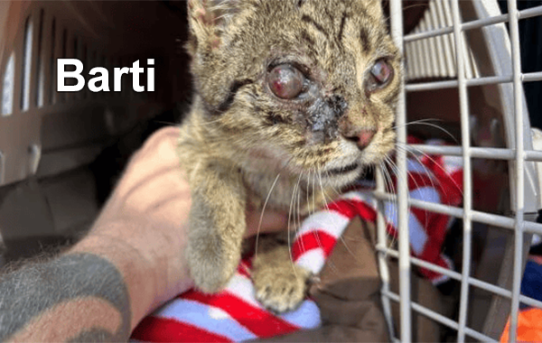 Dear, When someone came across tiny Barti in the woods on a freezing day, the fragile kitten was in excruciating pain. A raging infection had left his eyes swollen and oozing—his right eye nearly bursting. Barti had likely been dumped like trash—left to die. He was blind, sick, and so exhausted he barely responded to my touch. But as I lifted him into the rescue van, he started to purr. |